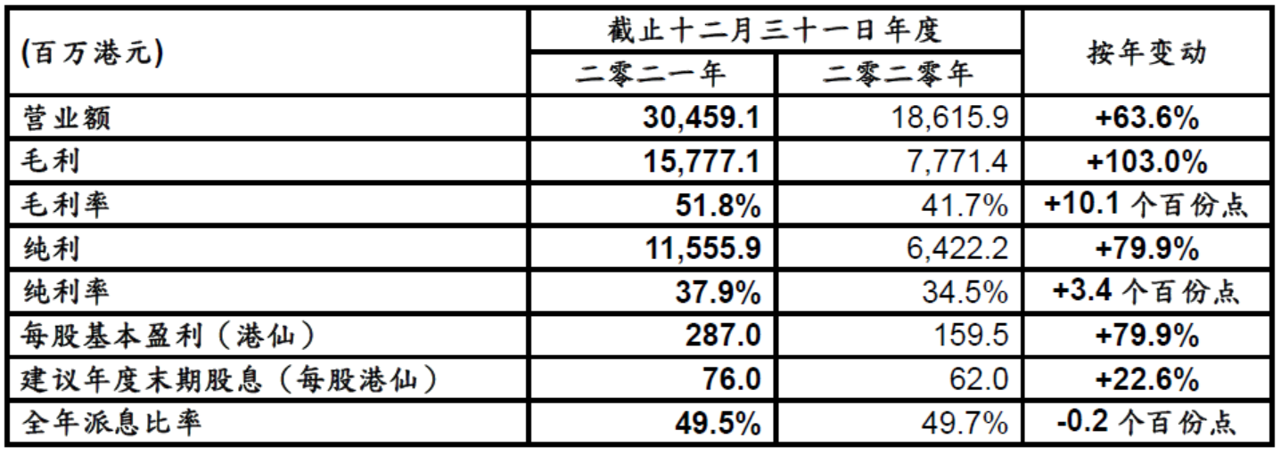 集团财务状况维持稳健,截至二零二一年十二月三十一日,手头现金为10,295.1百万港元(截至二零二零年十二月三十一日:5,304.1百万港元)。董事会建议派发末期股息每股76.0港仙。连同已派发的中期股息66.0港仙,全年共派息142.0港仙,全年派息比率为49.5%。