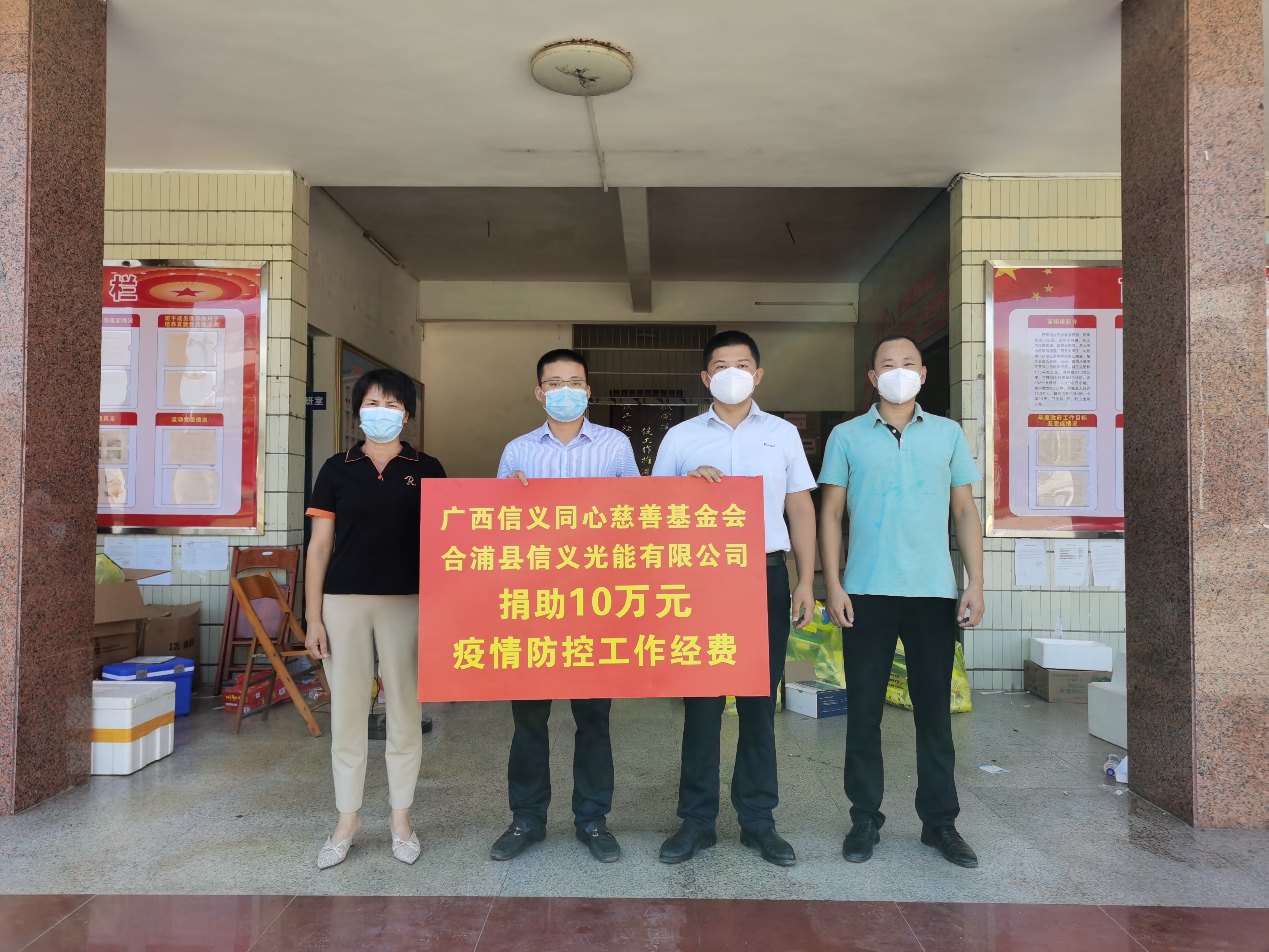 此次疫情期间,信义玻璃(广西)有限公司向北海市铁山港区计生服务站捐赠价值50万元的2辆负压救护车,向北海市铁山港区公安分局、政法系统、南康镇、兴港镇捐赠价值13万多元的防疫物资。广西信义同心慈善基金会联合合浦县信义光能有限公司、合浦信义新材料有限公司、合浦信义矿业有限公司、北海信善木材制品有限公司等向北海市合浦县捐赠现金50万元,用于当地疫情防控工作。