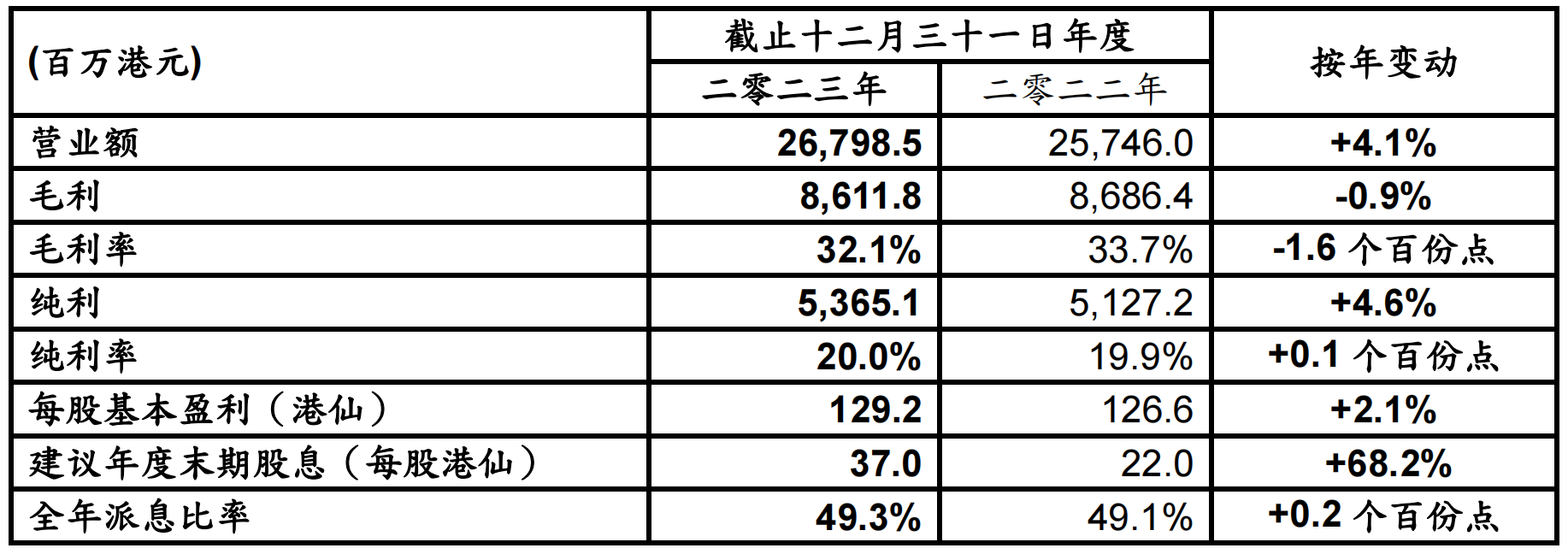 集团财务状况维持稳健,截至二零二三年十二月三十一日,手头现金为3,426.6百万港元(截至二零二二年十二月三十一日:8,167.3百万港元),银行贷款减少5,342.0百万港元,净资本负债比率降至13.3%。董事会建议派发末期股息每股37.0港仙,连同已派发的中期股息26.0港仙,全年共派息63.0港仙,全年派息比率为49.3%。