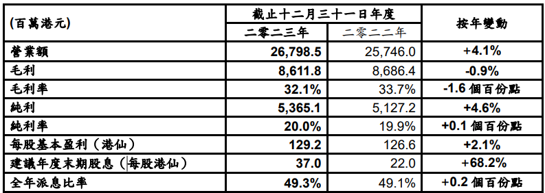 集團財務狀況維持穩健,截至二零二三年十二月三十一日,手頭現金為3,426.6百萬港元(截至二零二二年十二月三十一日:8,167.3百萬港元),銀行貸款減少5,342.0百萬港元,淨資本負債比率降至13.3%。董事會建議派發末期股息每股37.0港仙,連同已派發的中期股息26.0港仙,全年共派息63.0港仙,全年派息比率為49.3%。